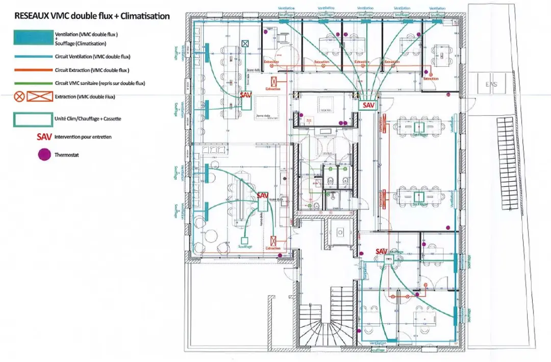 Locaux tertiaires avec plusieurs bureaux individuels et collectifs, nécessitant un traitement thermique différencié selon les zones et les usages.